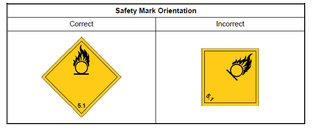 Labels and placards must be displayed "square on a point." That is, resting on a corner rather than on a side.